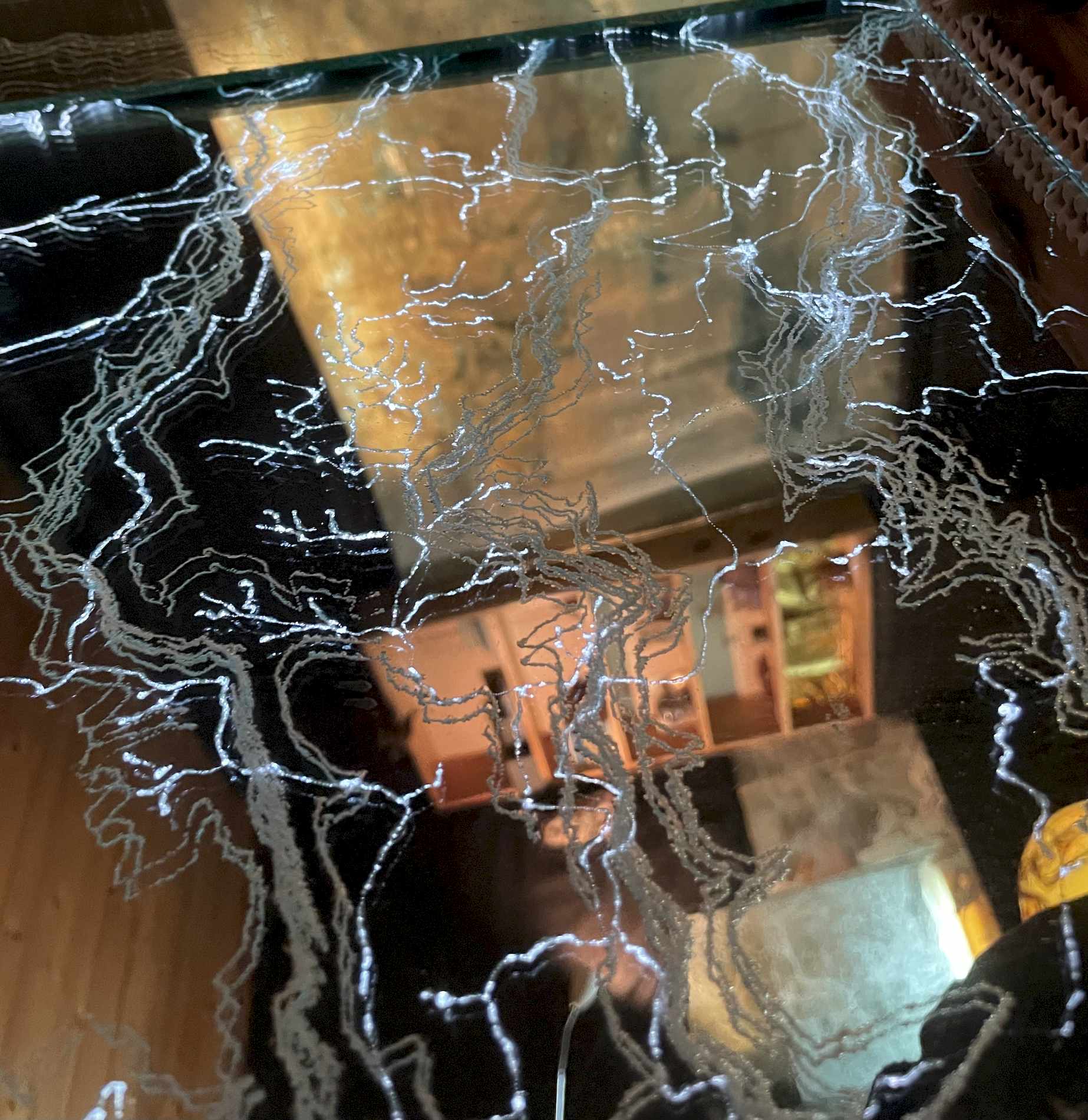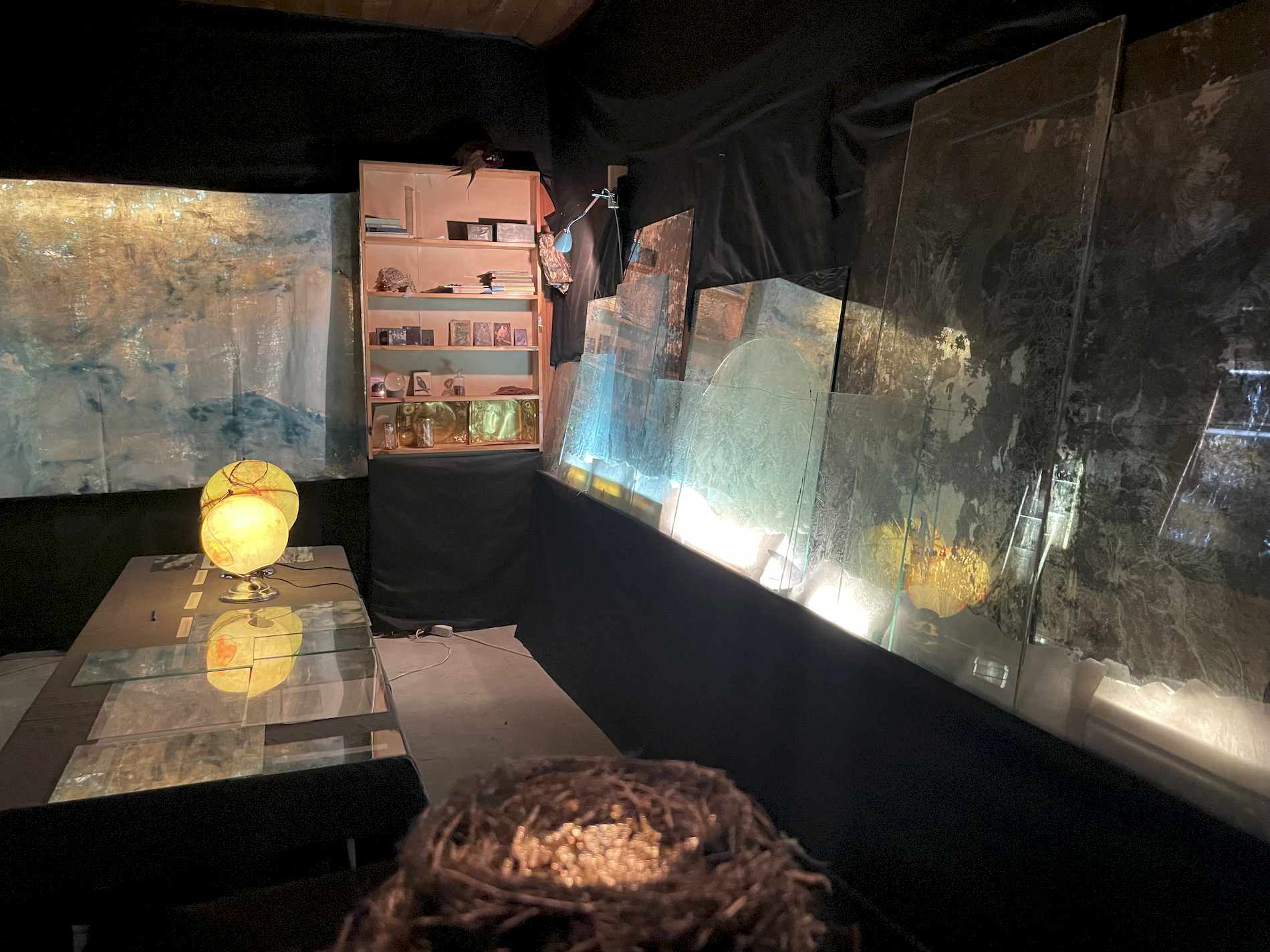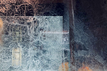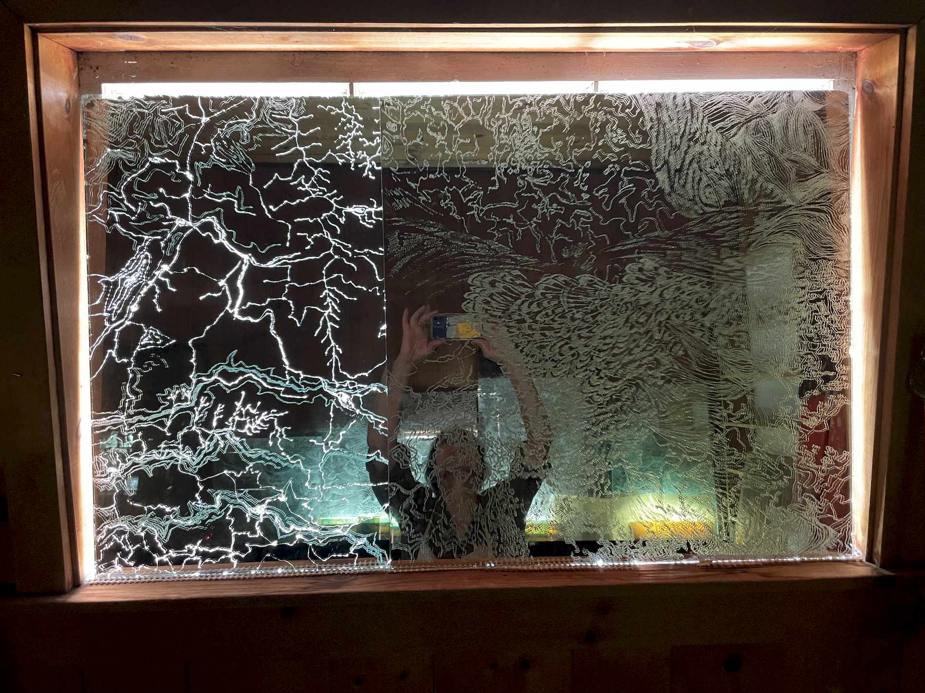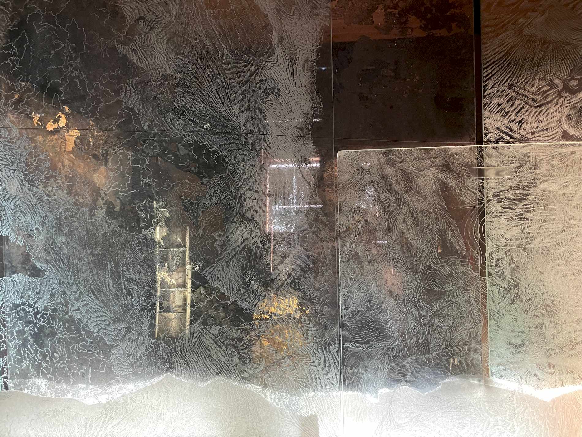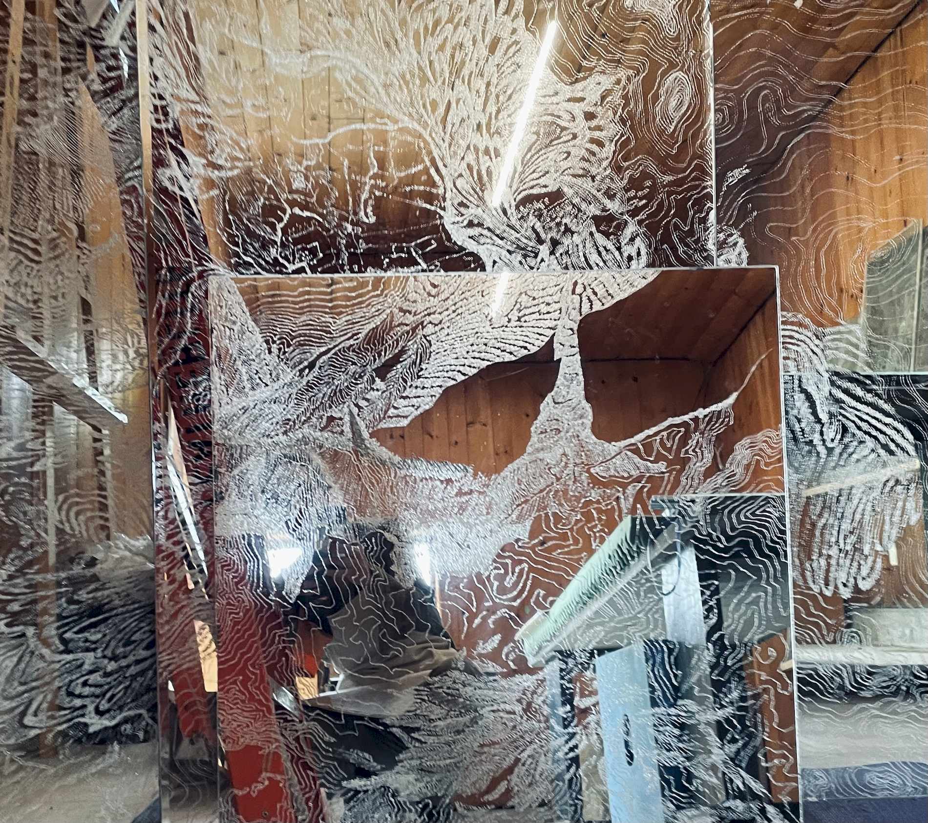 Carl (USA/Canada), who installed windows for a living, was so moved by the tragic imprints of birds’ wings left behind from their collisions with the glass that he would trace them onto carbon paper and transform the patterns into glass engravings. In his former workshop, discovered in a garage in Toronto, we find those engraved panes of glass and mirrors leaning against the walls. They not only picture the tracings of birds’ wings, but also recreate studied maps and migration routes, overlapping and interlacing with one another. Ornithology books, world atlases, maps and photos clutter the space amongst tools and personal detritus.