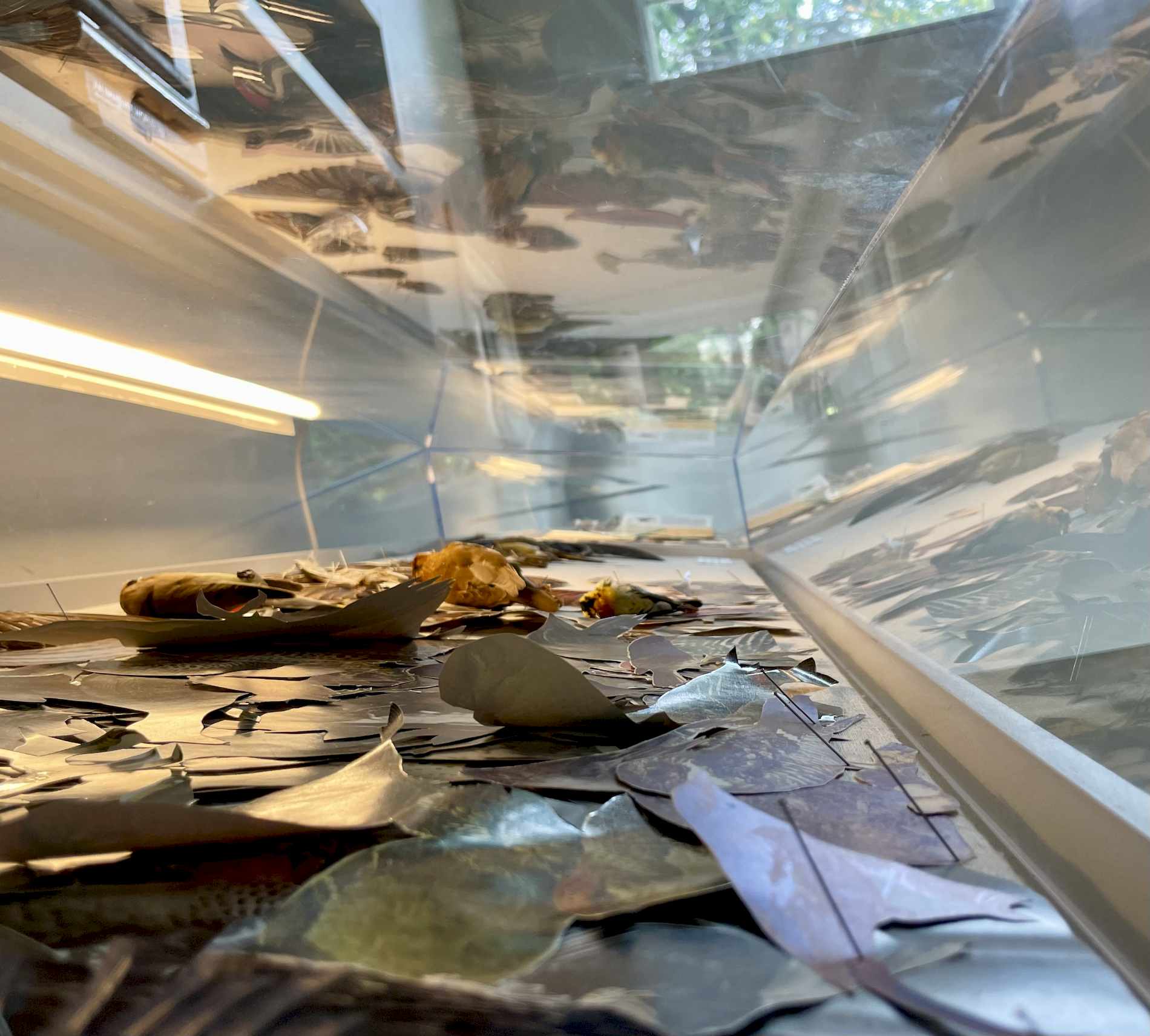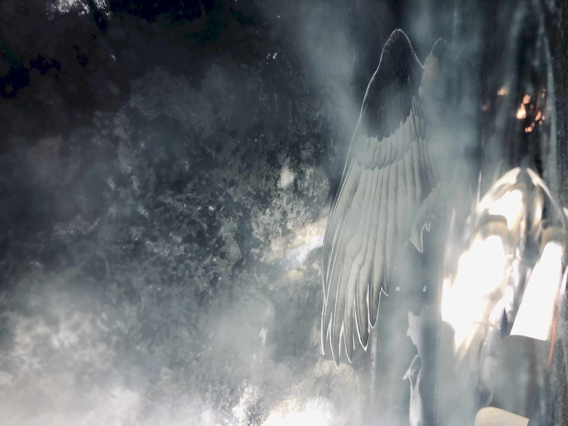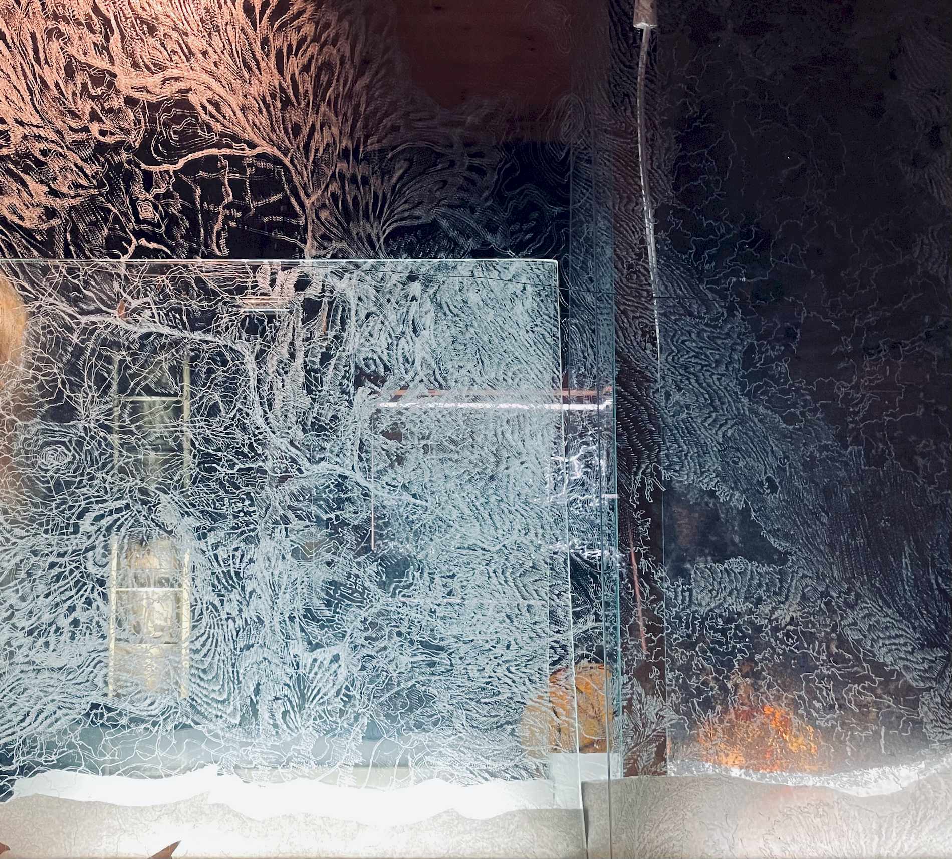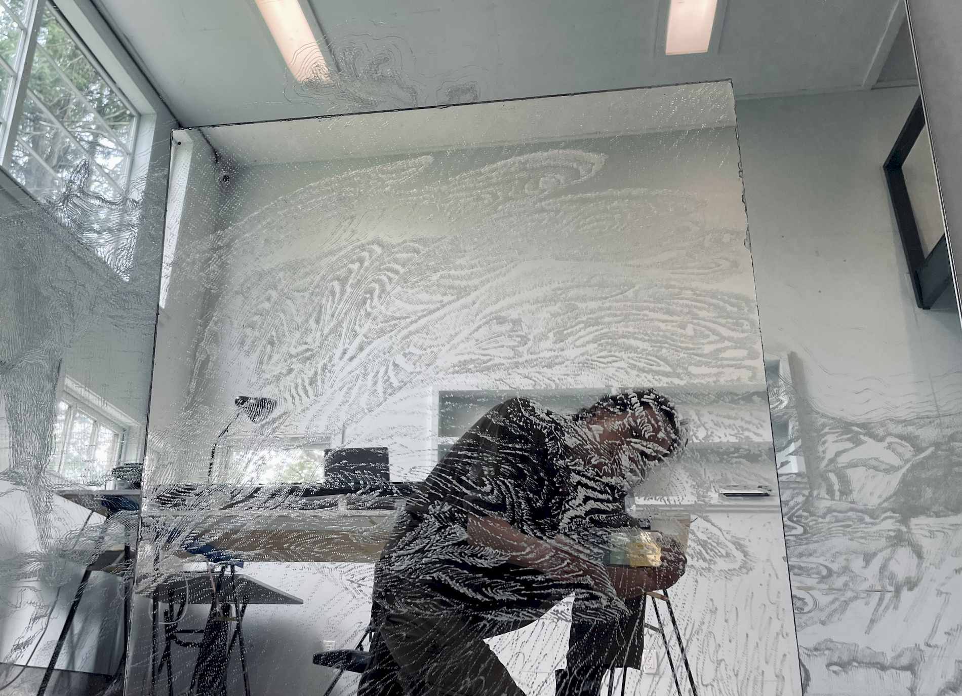 Carl (USA/Canada), who installed windows for a living, was so moved by the tragic imprints of birds’ wings left behind from their collisions with the glass that he would trace them onto carbon paper and transform the patterns into glass engravings. In his former workshop, discovered in a garage in Toronto, we find those engraved panes of glass and mirrors leaning against the walls. They not only picture the tracings of birds’ wings, but also recreate studied maps and migration routes, overlapping and interlacing with one another. Ornithology books, world atlases, maps and photos clutter the space amongst tools and personal detritus.
