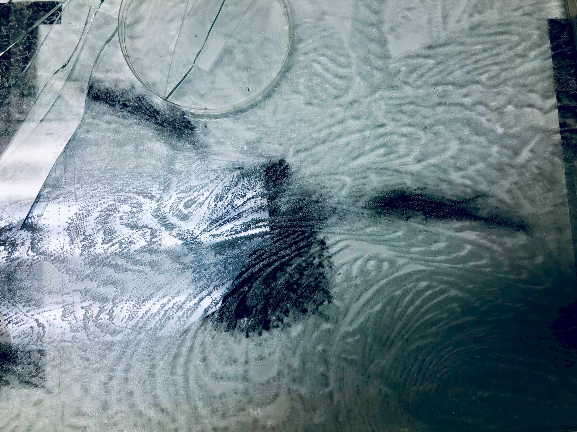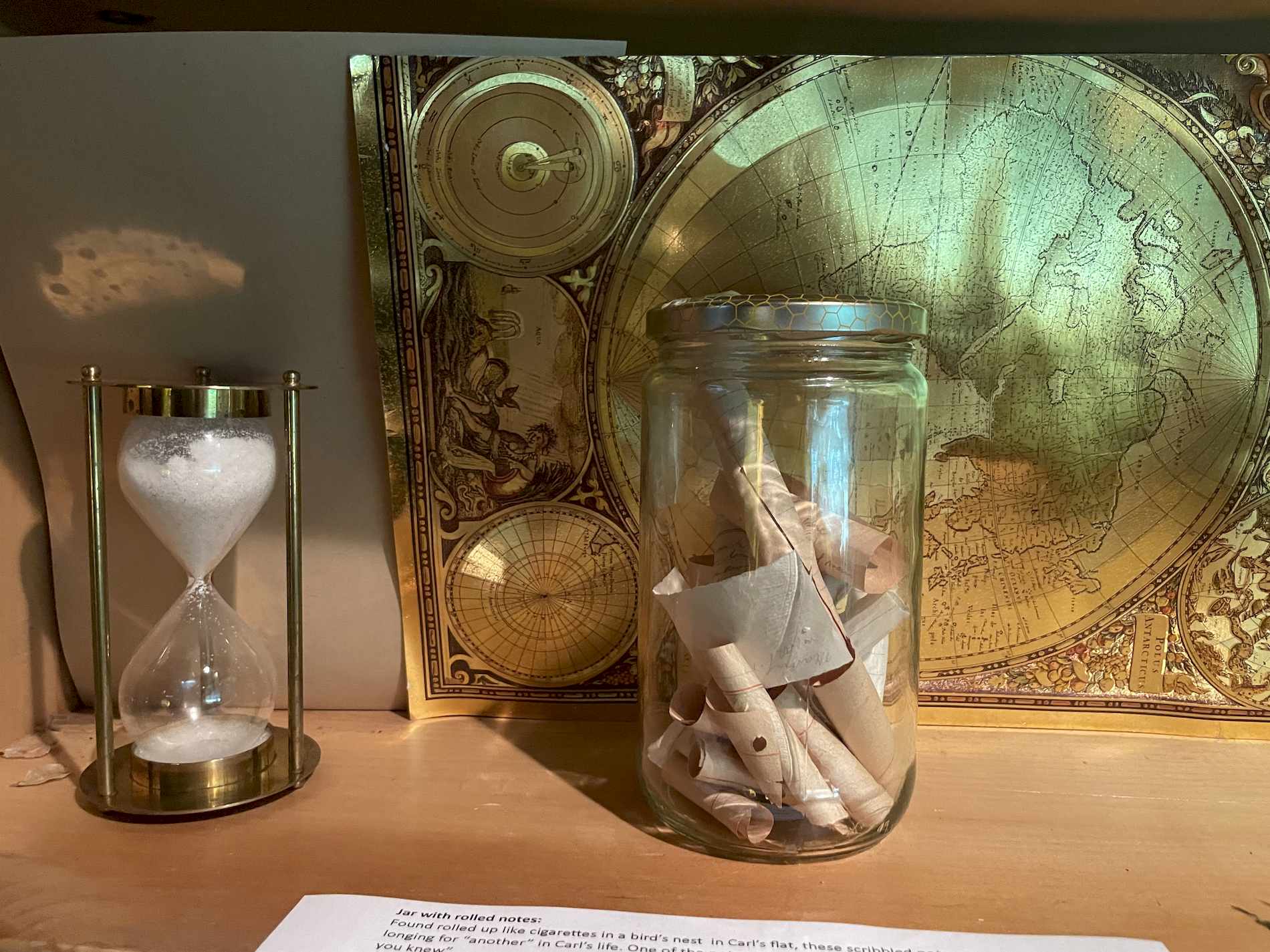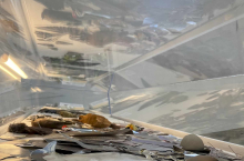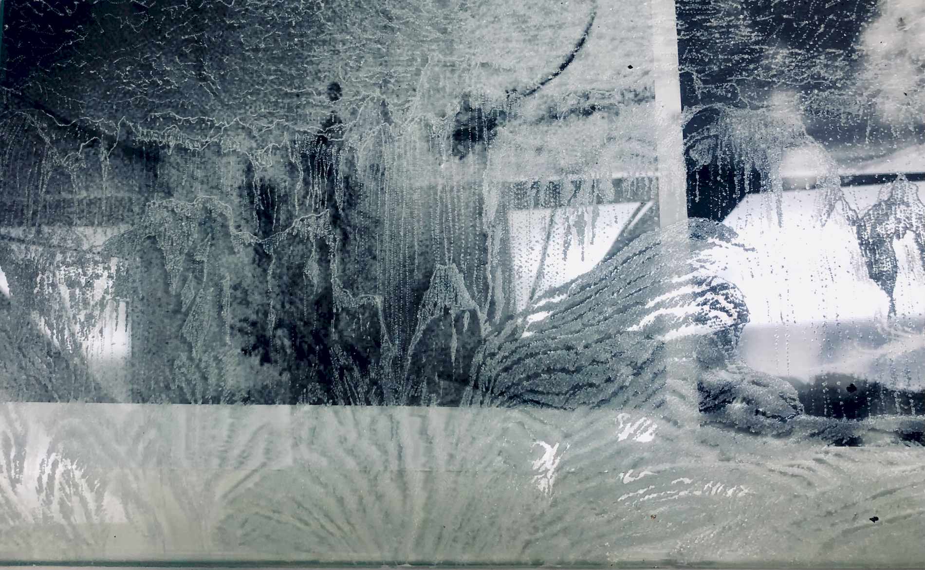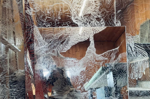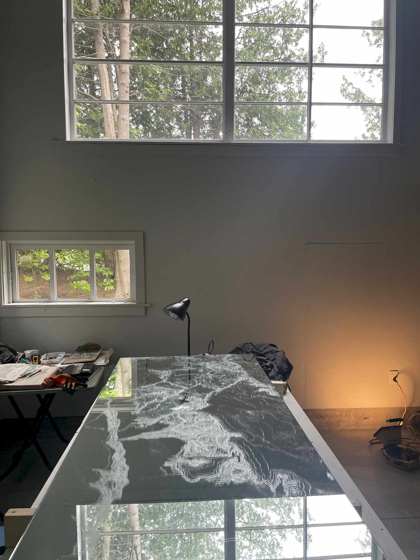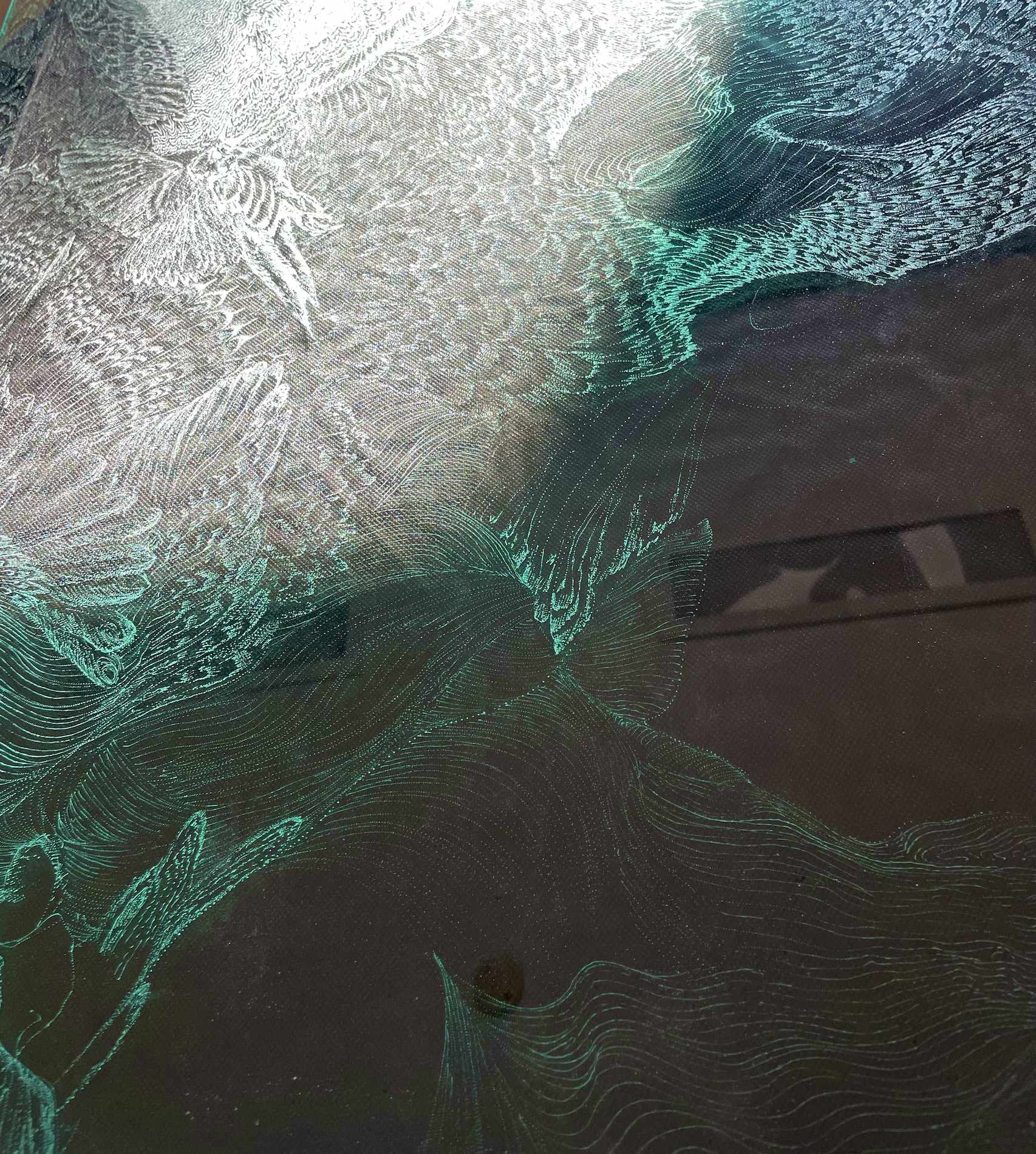 Carl (USA/Canada), who installed windows for a living, was so moved by the tragic imprints of birds’ wings left behind from their collisions with the glass that he would trace them onto carbon paper and transform the patterns into glass engravings. In his former workshop, discovered in a garage in Toronto, we find those engraved panes of glass and mirrors leaning against the walls. They not only picture the tracings of birds’ wings, but also recreate studied maps and migration routes, overlapping and interlacing with one another. Ornithology books, world atlases, maps and photos clutter the space amongst tools and personal detritus.