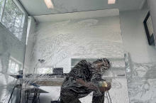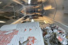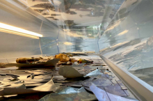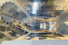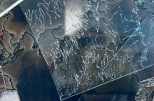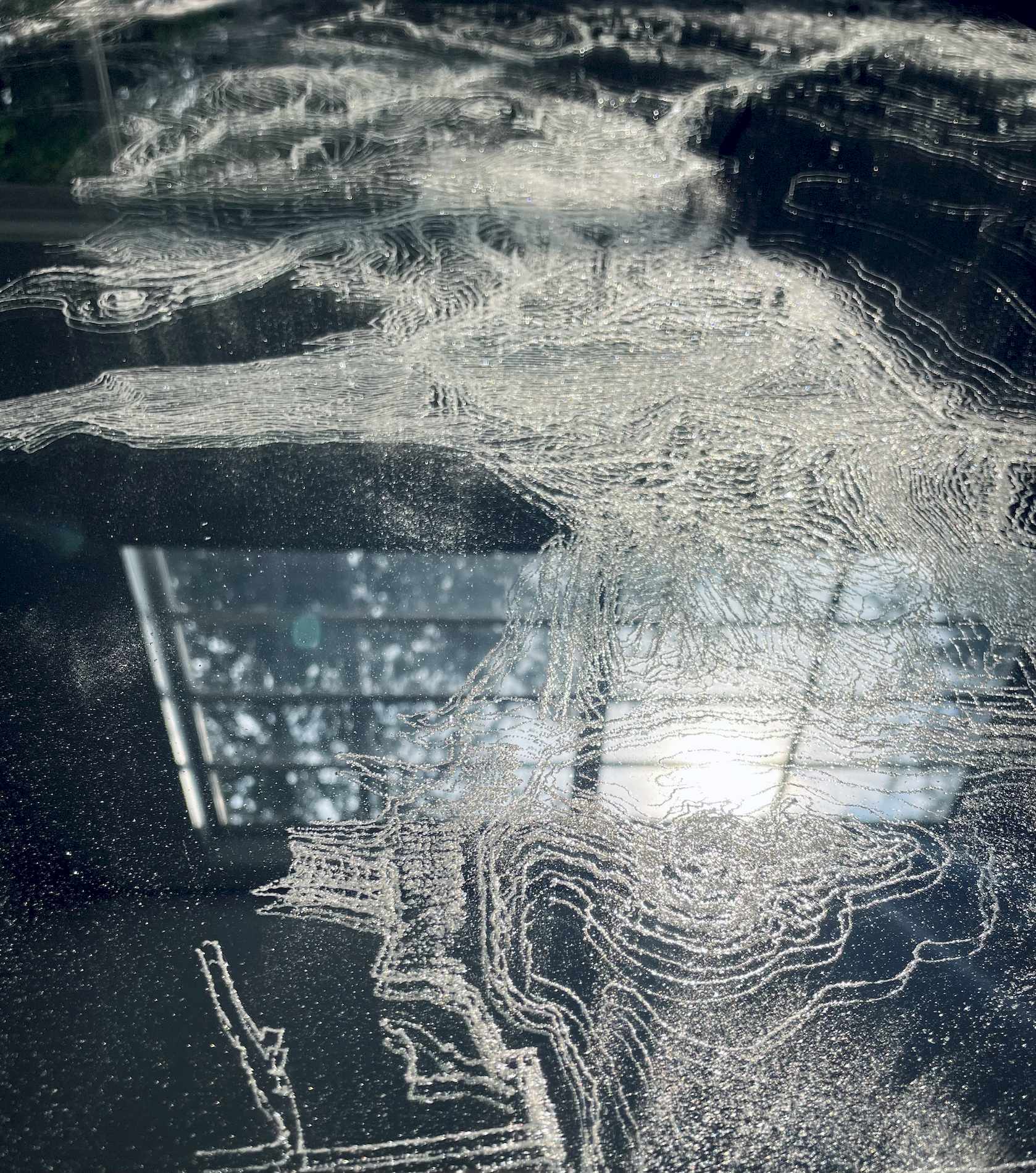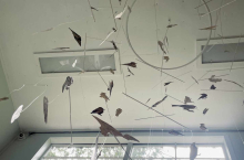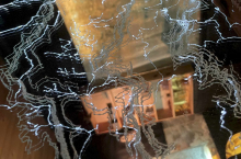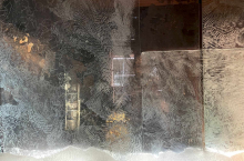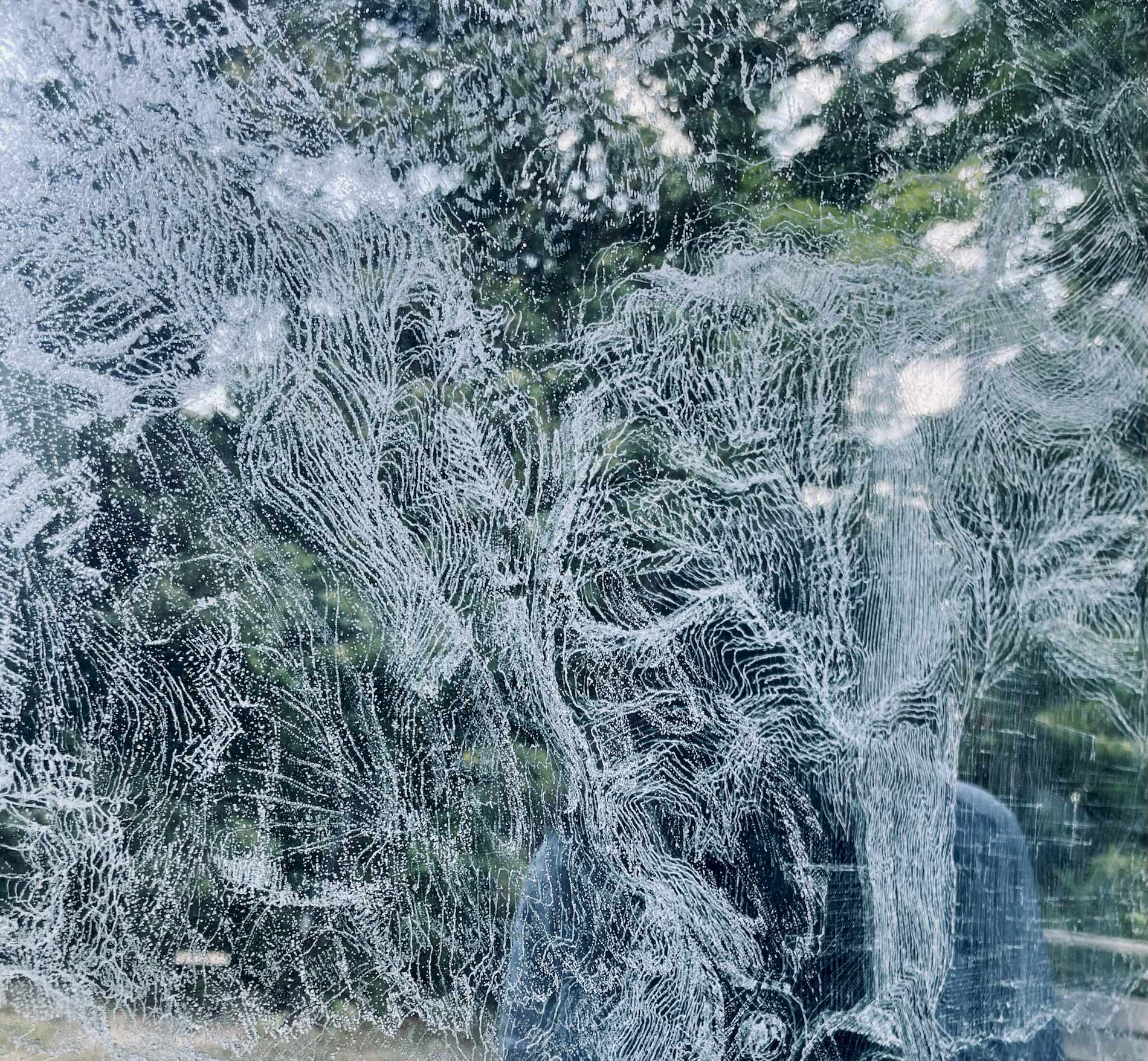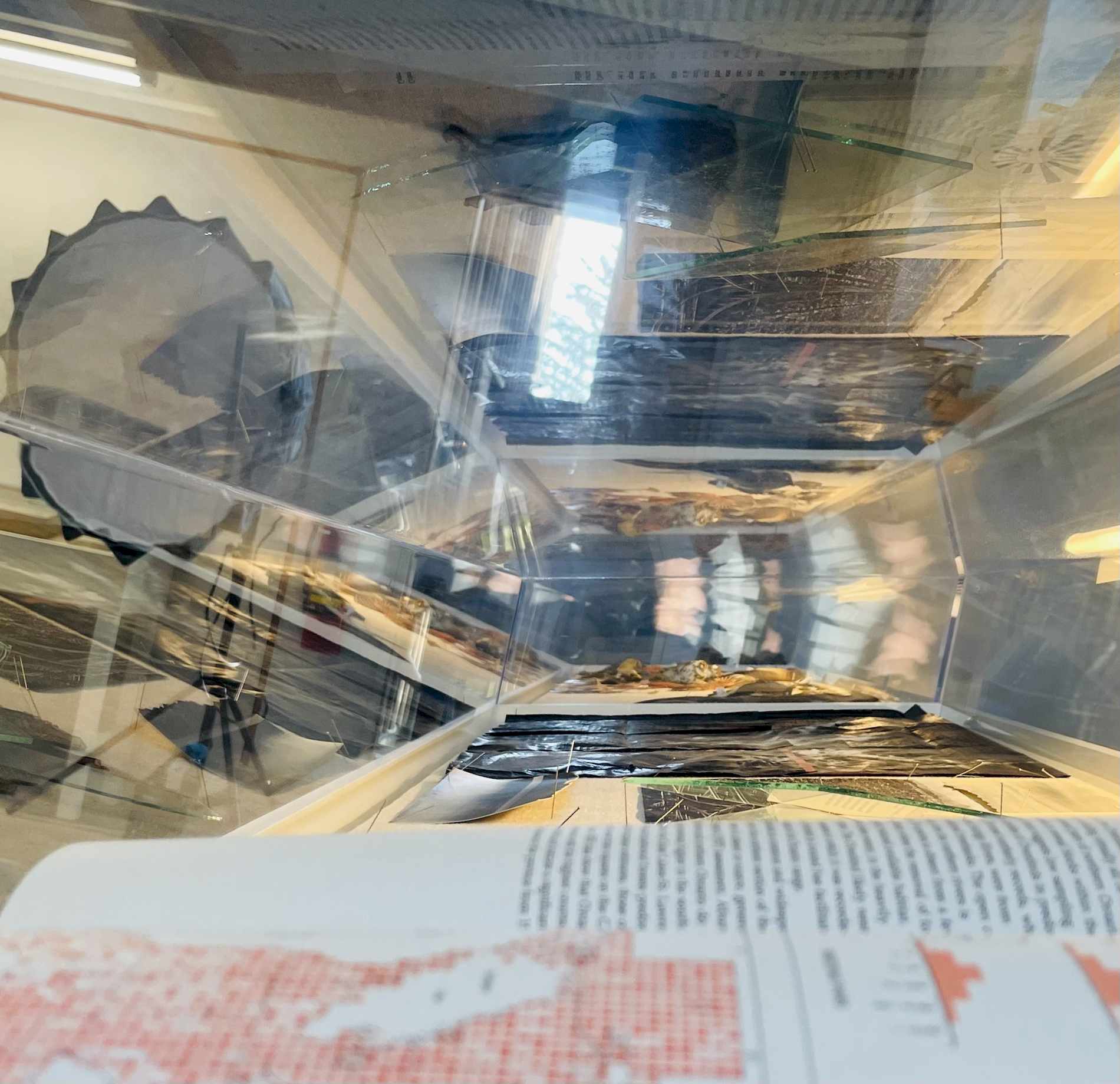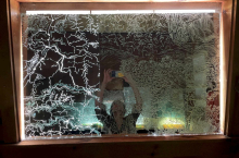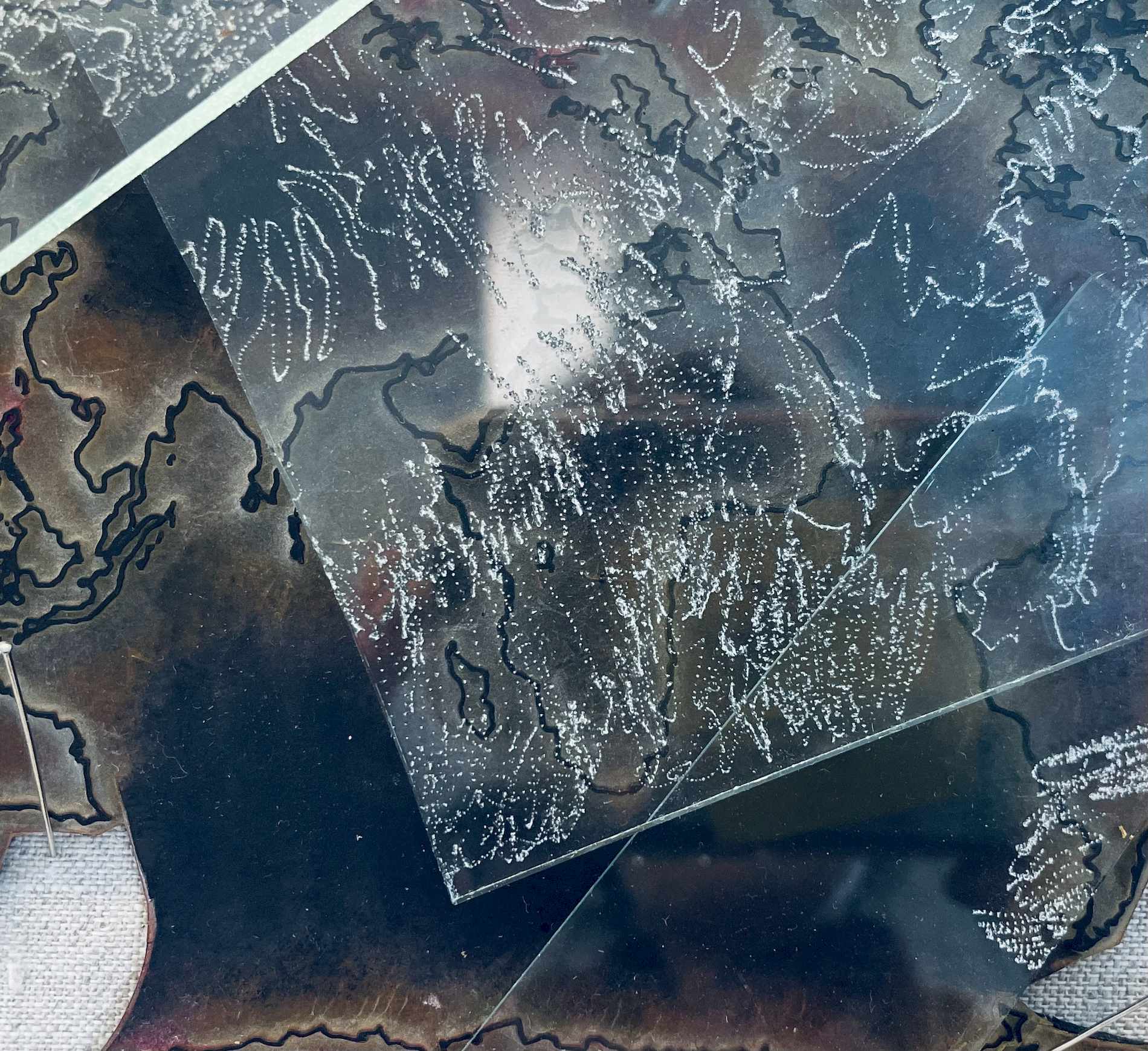 Carl (USA/Canada), who installed windows for a living, was so moved by the tragic imprints of birds’ wings left behind from their collisions with the glass that he would trace them onto carbon paper and transform the patterns into glass engravings. In his former workshop, discovered in a garage in Toronto, we find those engraved panes of glass and mirrors leaning against the walls. They not only picture the tracings of birds’ wings, but also recreate studied maps and migration routes, overlapping and interlacing with one another. Ornithology books, world atlases, maps and photos clutter the space amongst tools and personal detritus.