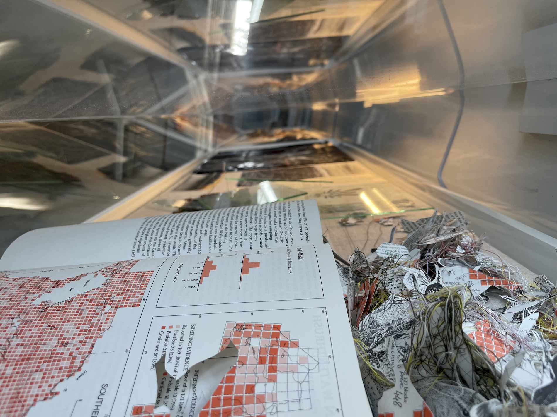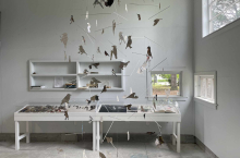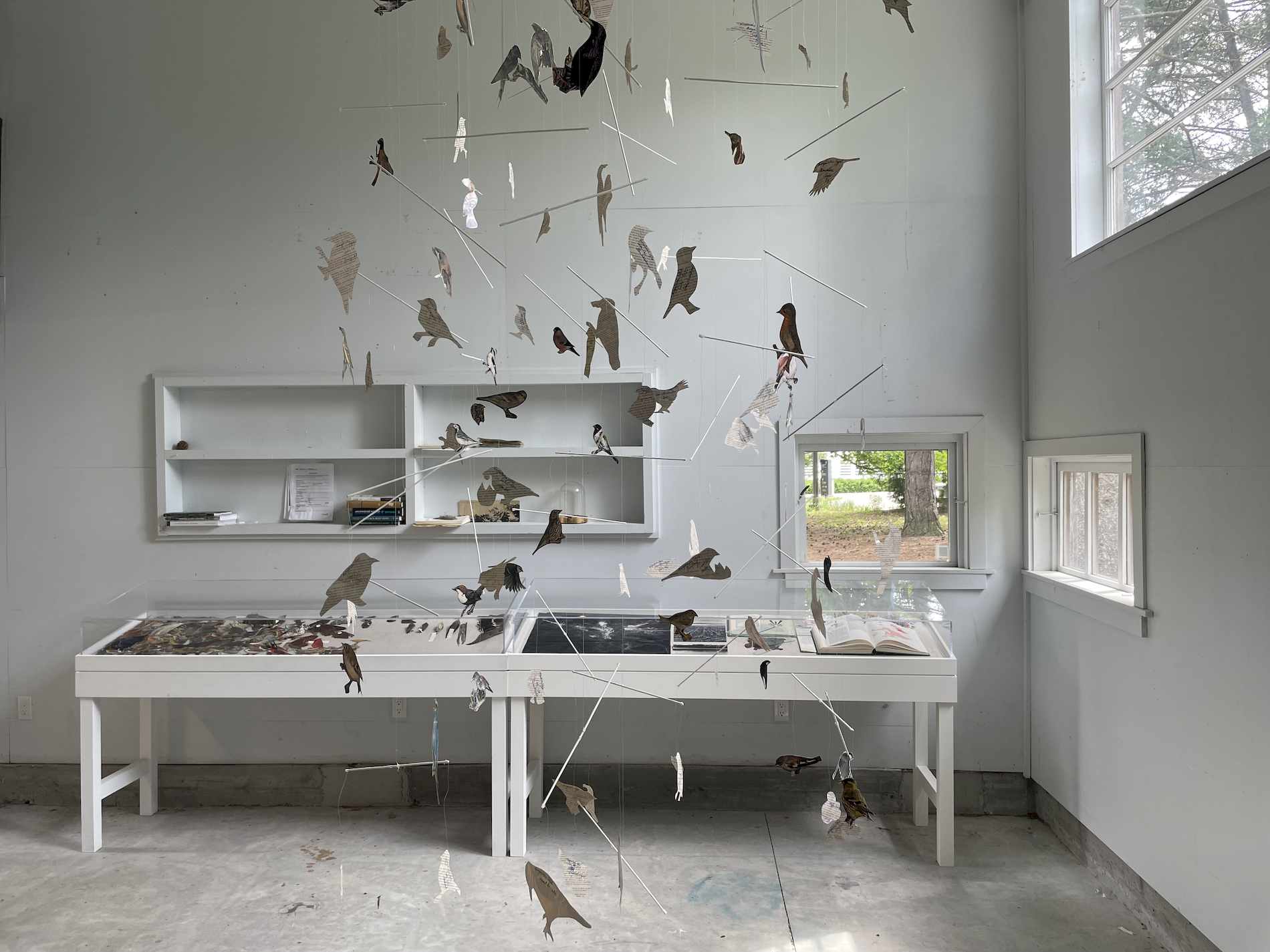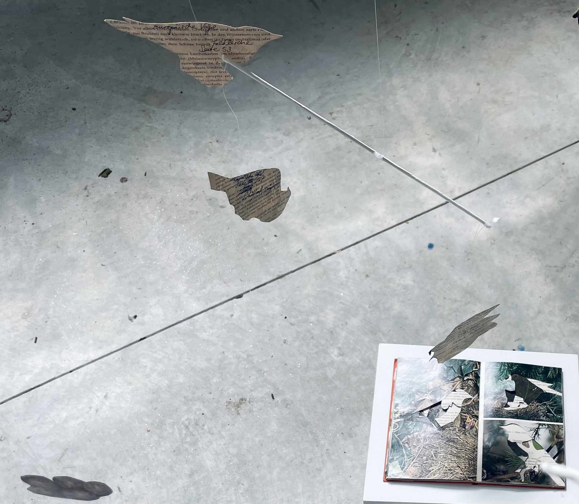 The twin Kurt (Germany), collected ornithology books, which he deconstructed, cutting out every illustration that depicted a bird. While more and more bird-shaped gaps and holes appeared in the books, the resulting cut-outs became intricate and delicate mobiles. His studio, a vacant room in the basement of a house at Schöneberger Ufer 61 in Berlin, Germany, was filled with books and cassette tapes of bird songs. Underneath a sheet of hand-painted canvas attached to the ceiling, hung hundreds of cut-out birds, each painstakingly cataloged with the page number and title of the book from which it came. Fluttering above an old armchair, these simple cut-outs transformed the tiny basement into a space both mysterious and boundless.
