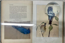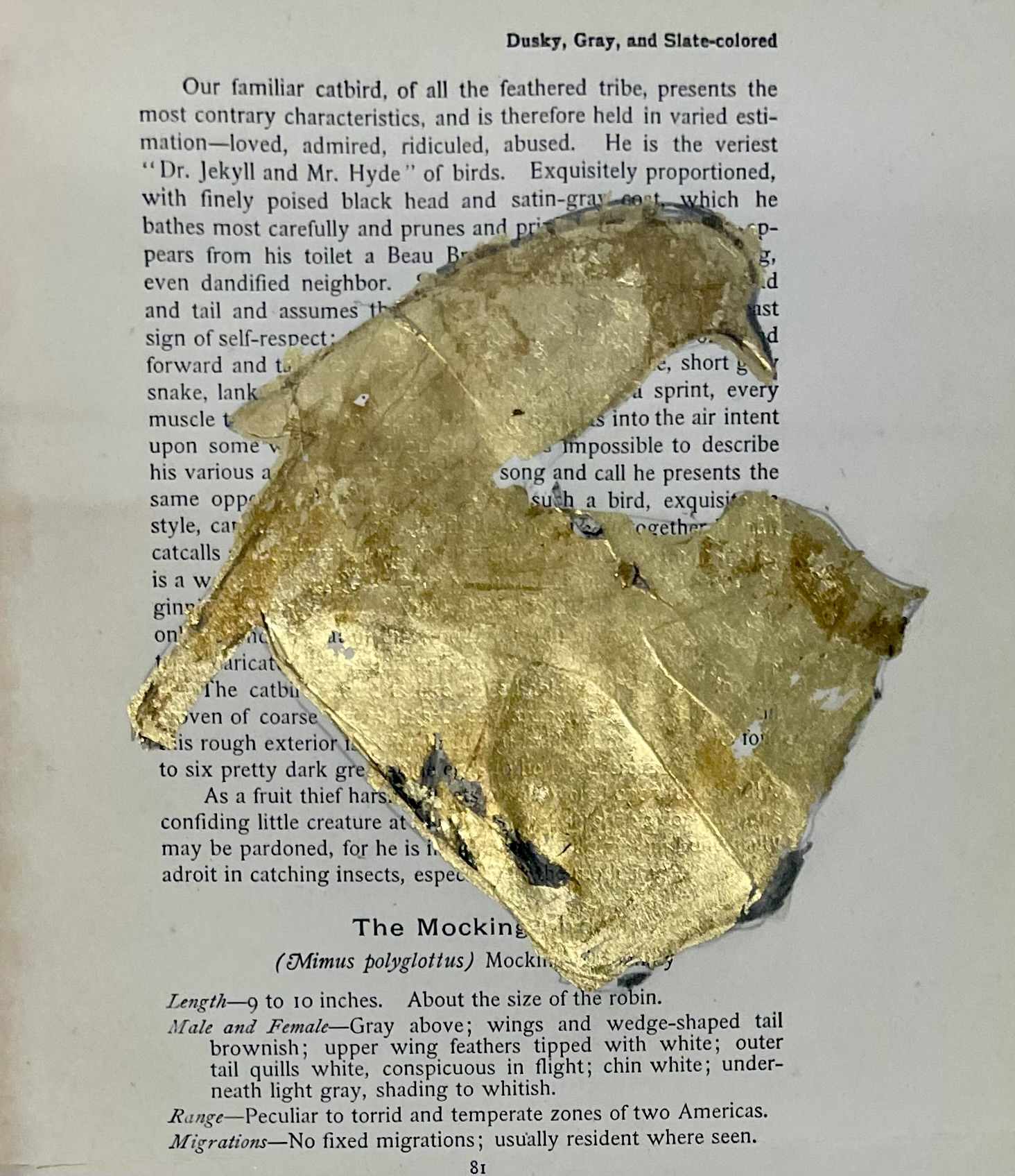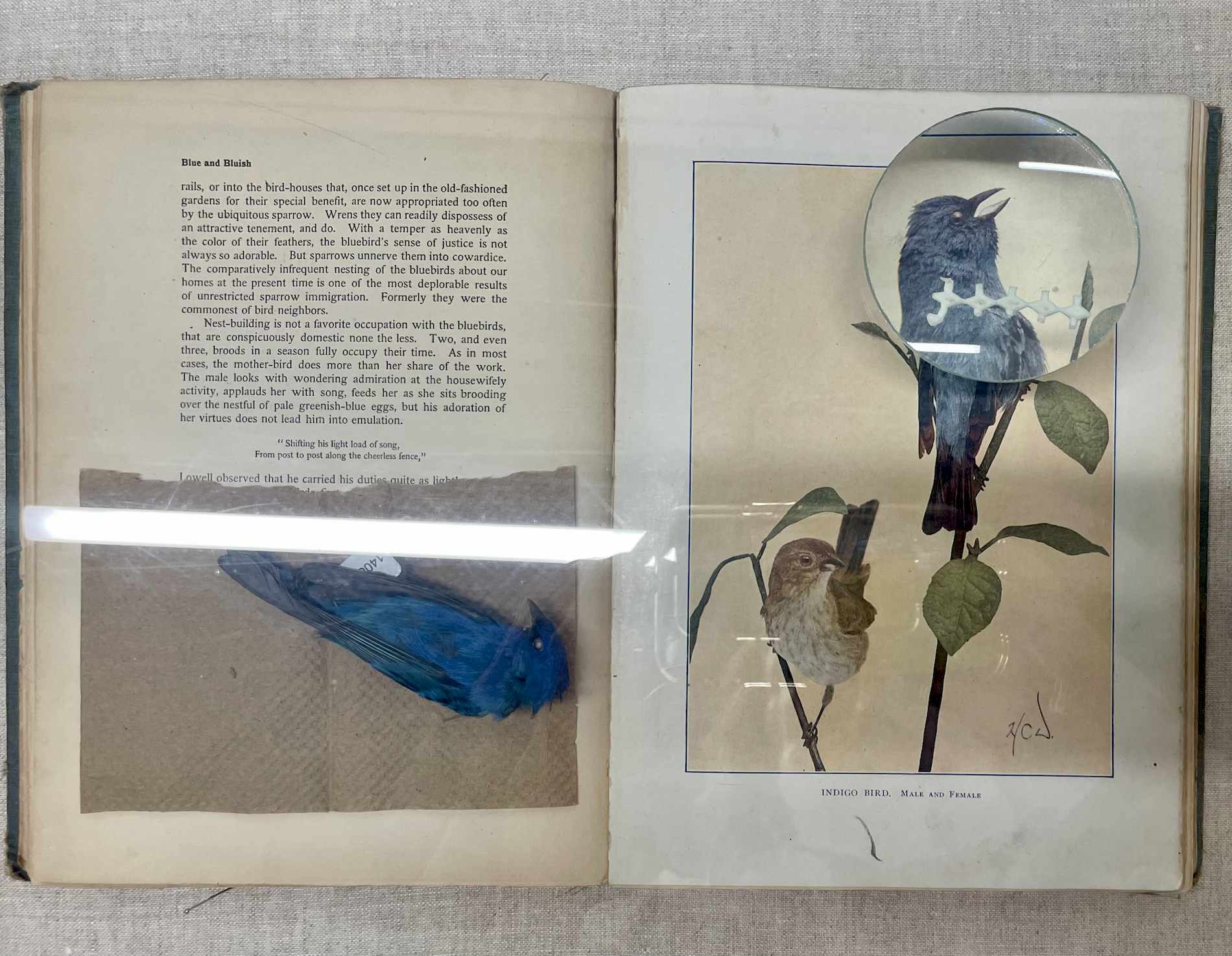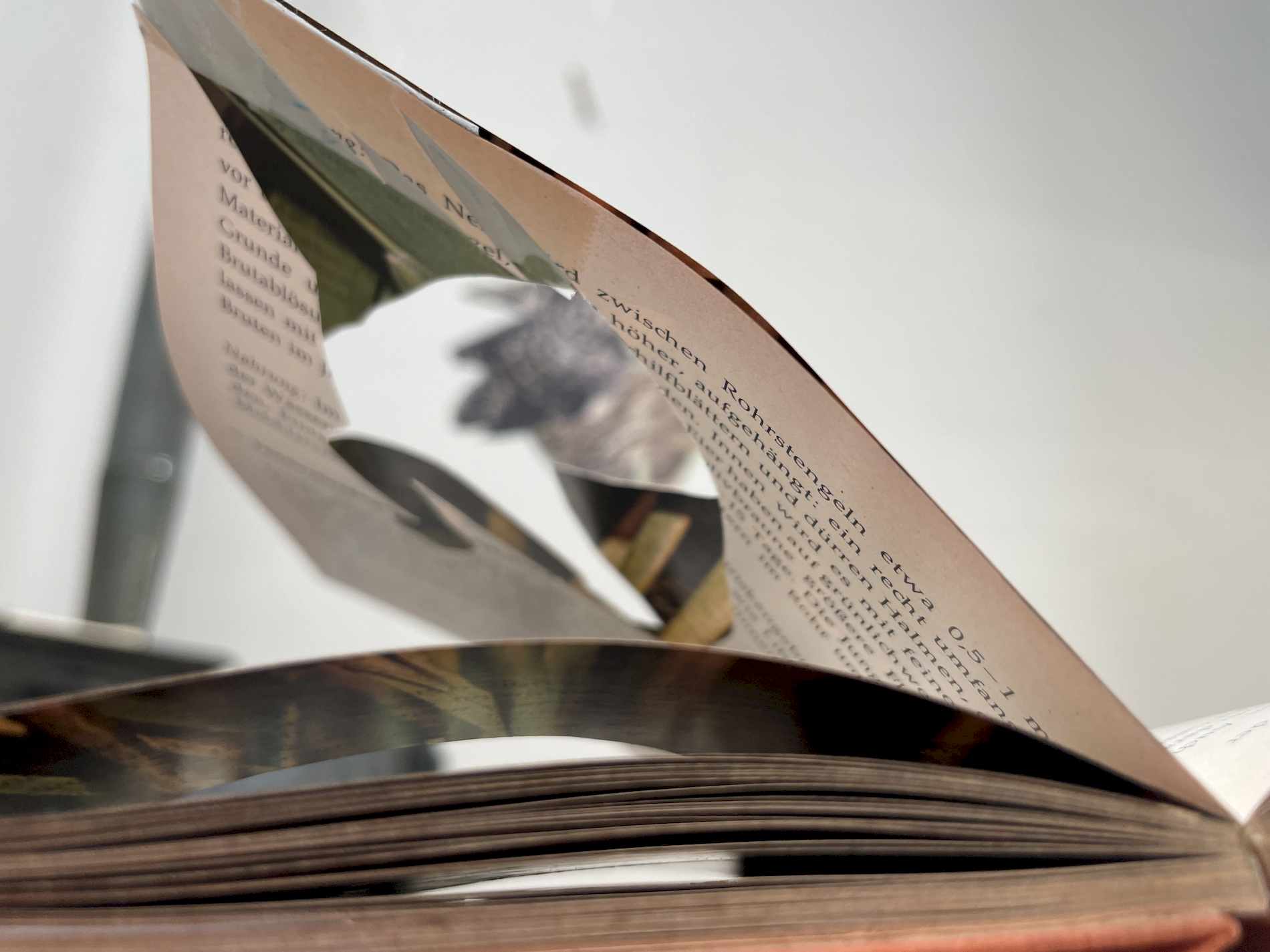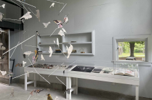 The twin Kurt (Germany), collected ornithology books, which he deconstructed, cutting out every illustration that depicted a bird. While more and more bird-shaped gaps and holes appeared in the books, the resulting cut-outs became intricate and delicate mobiles. His studio, a vacant room in the basement of a house at Schöneberger Ufer 61 in Berlin, Germany, was filled with books and cassette tapes of bird songs. Underneath a sheet of hand-painted canvas attached to the ceiling, hung hundreds of cut-out birds, each painstakingly cataloged with the page number and title of the book from which it came. Fluttering above an old armchair, these simple cut-outs transformed the tiny basement into a space both mysterious and boundless.